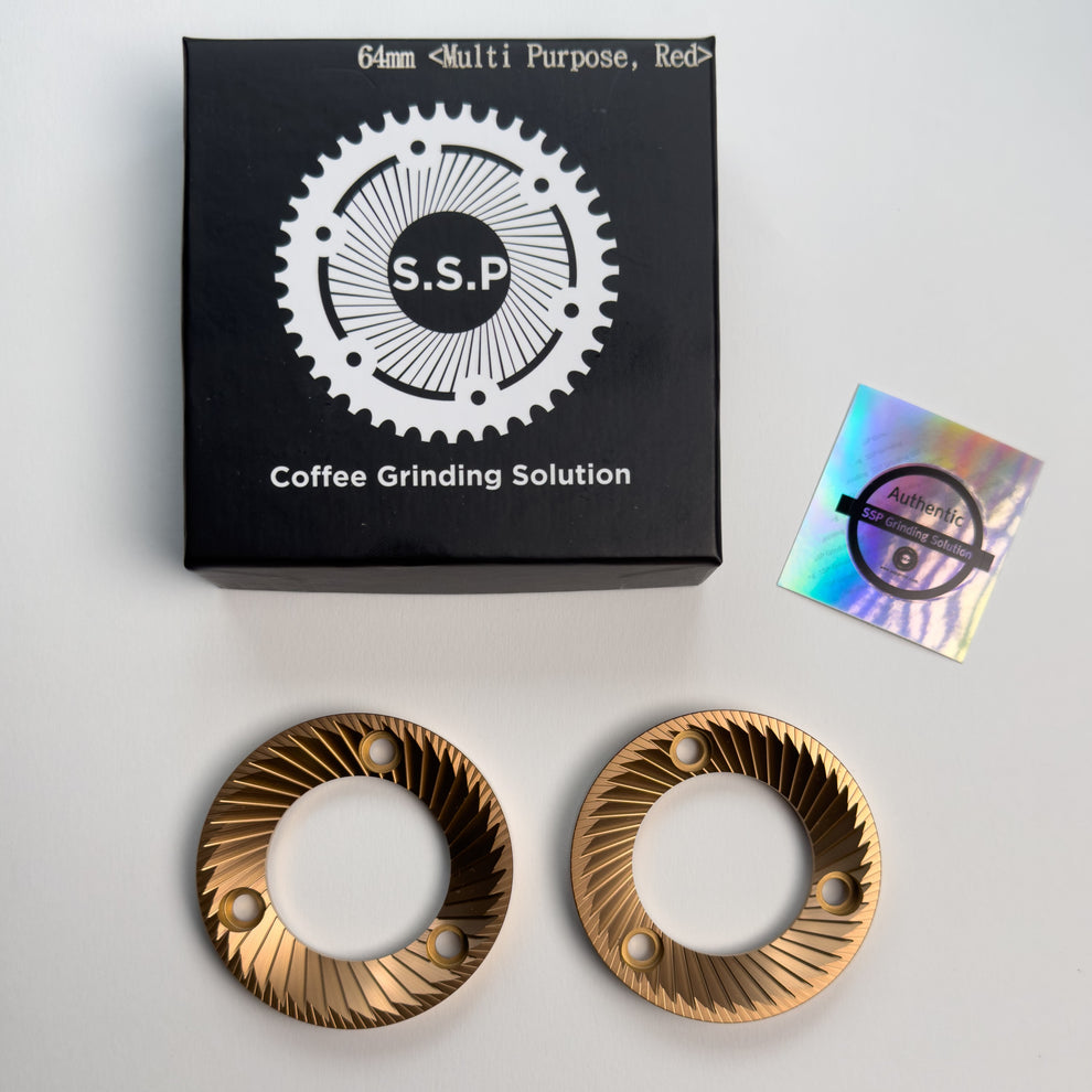 شفرات SSP المسطحة مقاس 64 مم مصنوعة من فولاذ الأدوات ومطلية بمادة Red Speed (تيتانيوم-ألومنيوم-كربون-نتريد – TiAICN)، ويمكنها طحن أكثر من 10,000 رطل (حوالي 4500 كجم) من القهوة قبل الحاجة إلى استبدالها.