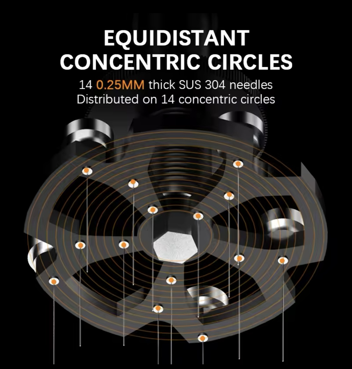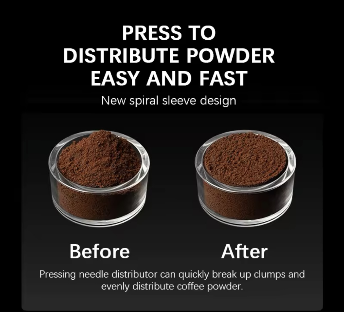 【الفولاذ المقاوم للصدأ دبوس】:توزيع الإسبريسو أداة بها 14 دبوسًا رفيعًا بسمك 0.25 مم مصنوعة من الفولاذ المقاوم للصدأ 304، مرتبة في دوائر متحدة المركز، تعمل على التكسير بكفاءة وتضمن توزيعًا متساويًا للمسحوق أثناء الدوران